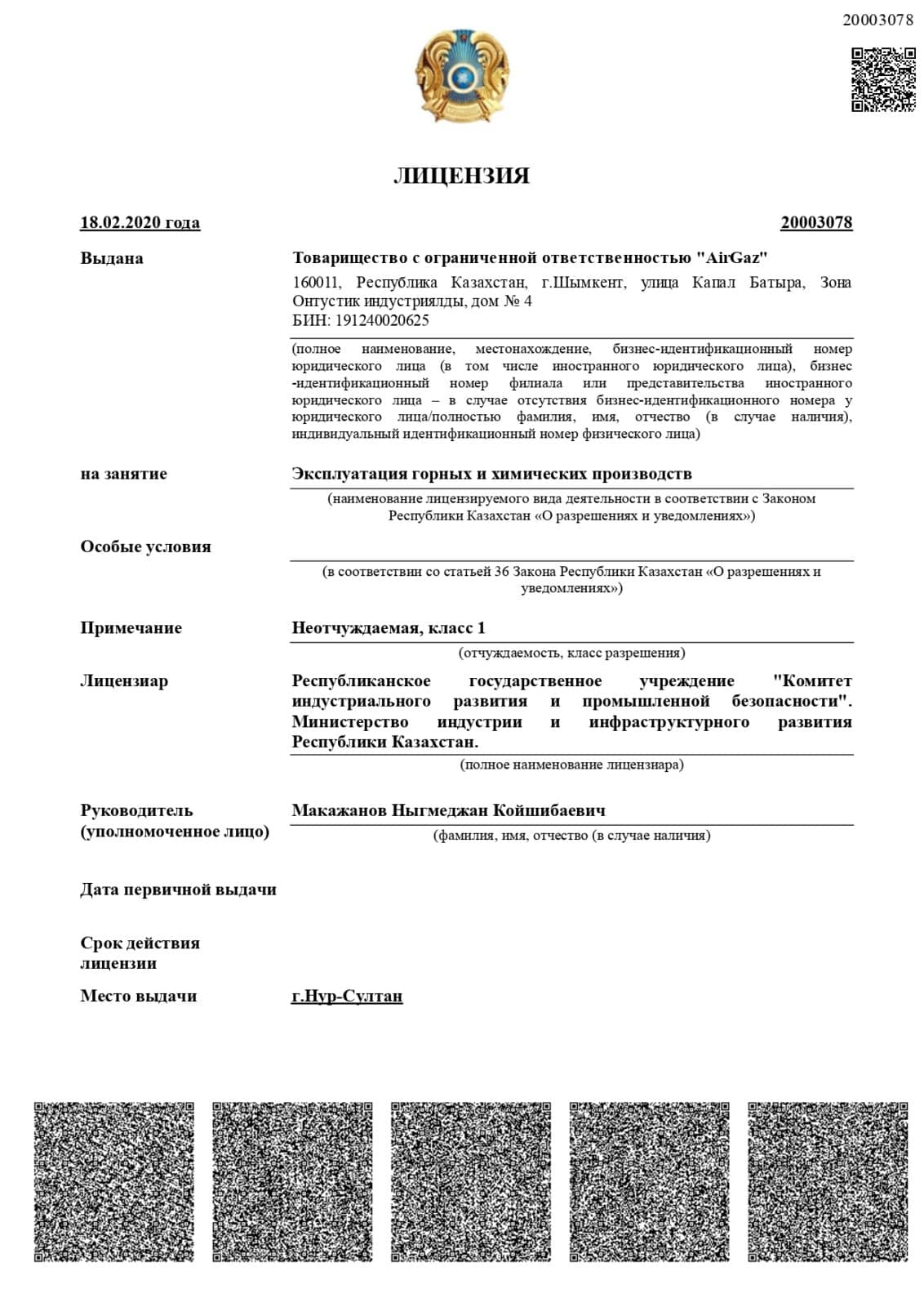 Криогенный завод ТОО «AirGaz» — современный завод по переработке атмосферного воздуха путем низкотемпературной ректификации и компрессионного сжатия воздуха до требуемого рабочего давления, конечной целью производственного цикла которого является выпуск высококачественных промышленных и медицинских газов. Завод введен в эксплуатацию в 2019 году и расположен в индустриальной зоне «Оңтүстік» Энбекшинского района г.Шымкент. На балансе завода действует аттестованная НаЦЭкС лаборатория, осуществляющая строгий контроль качества производимой продукции и соблюдение технологического процесса. Персонал завода составляют опытные специалисты, обеспечивающие обслуживание всей технологической цепочки и контролирующие точное исполнение утвержденного технологического регламента предприятия – от производства до адресной доставки газа до потребителя, согласно заявки.